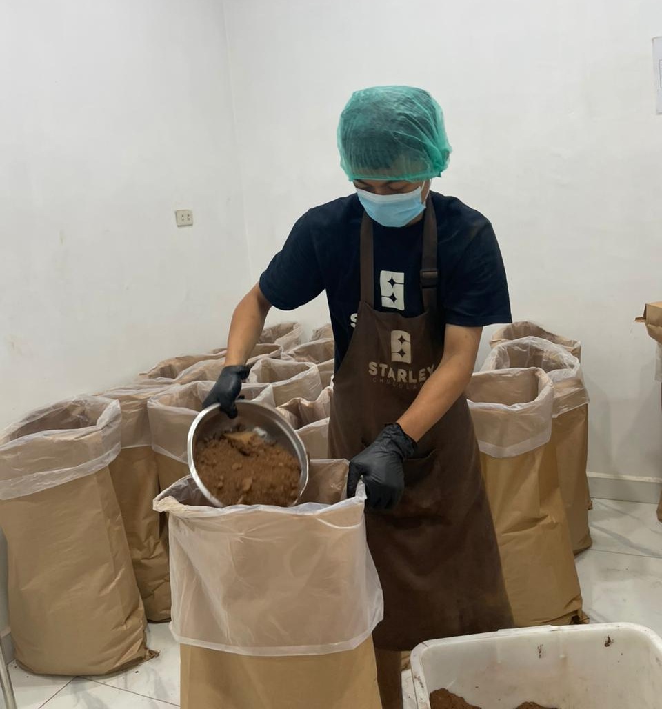 The production process of Starley Chocolate begins with cocoa bean selection, fermentation, drying, beans sorting, roasting, shell separation, grinding, and producing cocoa liquor. From this stage, various derivative products are made, such as cocoa butter, cocoa cake, and ready-to-consume chocolate bars.
